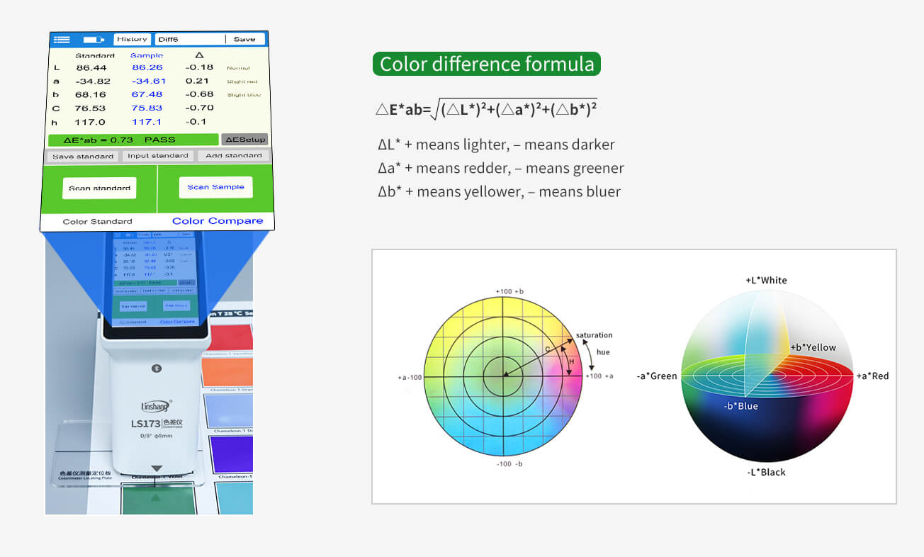 Máy phân tích màu có nhiều không gian màu như Lab\RGB\CMYK và nhiều công thức khác biệt về màu sắc, đáp ứng nhu cầu đo màu của các ngành công nghiệp khác nhau